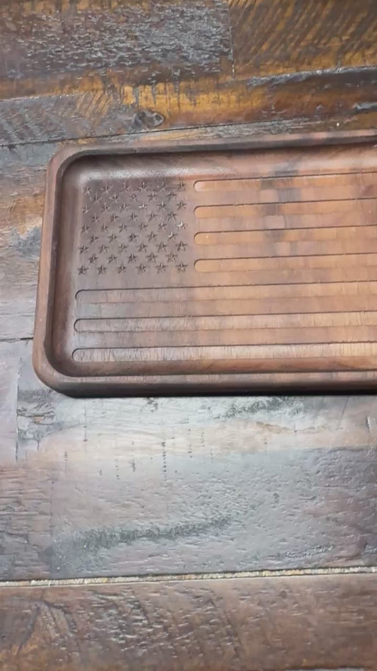 A perfect blend of craftsmanship, elegance, and patriotism. Made from premium hardwood, known for its rich, dark tones and natural beauty, this catchall tray features a meticulously engraved American flag design that showcases the intricate details of the stars and stripes.