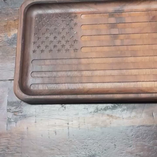 Introducing our handcrafted Black Walnut American Flag Catchall Tray — a perfect blend of craftsmanship, elegance, and patriotism. Made from premium black walnut wood, known for its rich, dark tones and natural beauty, this catchall tray features a meticulously engraved American flag design that showcases the intricate details of the stars and stripes.