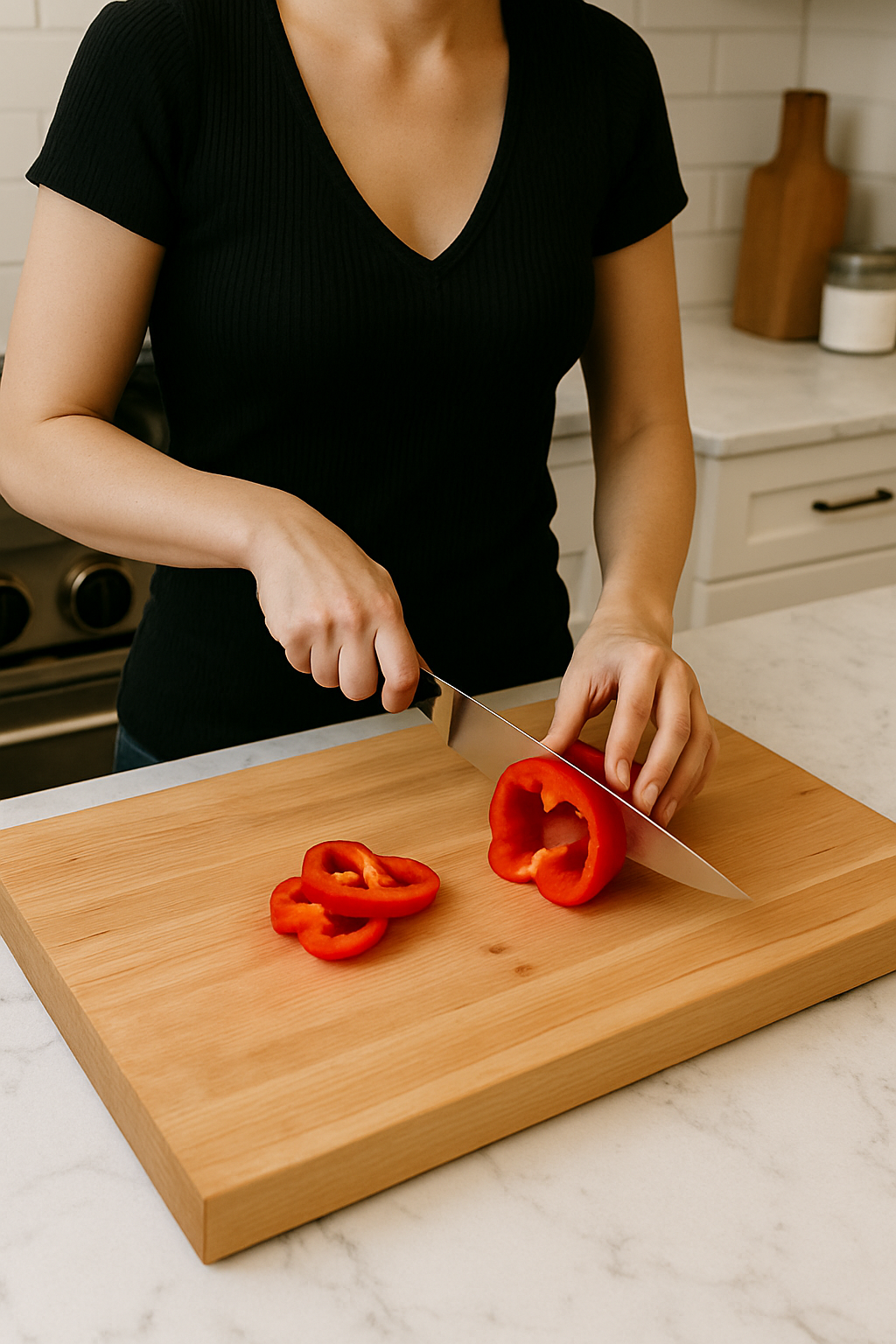 The edge grain construction ensures durability and strength, making this cutting board perfect for everyday kitchen tasks, from chopping and slicing to serving and presentation. The natural oils in the hardwoods provide a smooth, self-healing surface that resists knife marks, helping to maintain the board’s beauty over time.