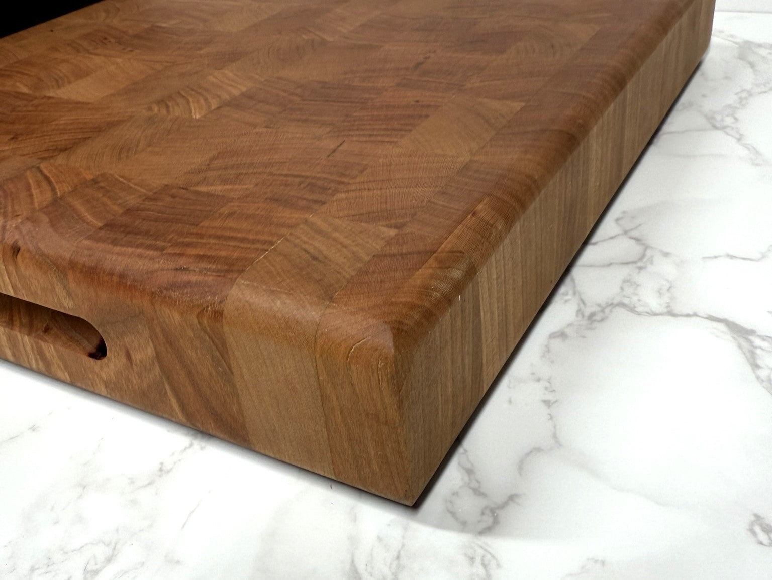 A Cherry end grain cutting board is a beautifully crafted kitchen essential that combines durability with striking visual appeal. Made from high-quality cherry wood, known for its rich, natural tones and smooth texture, this board is constructed using the end grain of the wood, which means the wood fibers are aligned vertically. This unique construction method not only enhances the board's natural aesthetic with a distinctive pattern but also makes it gentler on knife blades, helping them stay sharp longer. End grain cutting boards are particularly prized for their resilience. The vertical fibers allow knives to sink into the board without causing excessive wear, making it ideal for chopping, dicing, and slicing. Additionally, the self-healing properties of the end grain mean that knife marks are less likely to show over time, maintaining the board's pristine look. A cherry end grain cutting board also offers superior strength and stability, ensuring it stays steady during use. The rich, vibrant hues of the cherry create a timeless, elegant piece that complements a variety of kitchen styles. Whether used for meal prep or as a serving board, it provides a functional yet sophisticated surface that enhances both cooking and presentation. Properly maintained with periodic oiling, a walnut end grain cutting board can last a lifetime, becoming more beautiful with age.