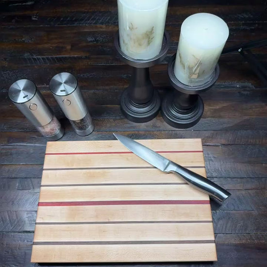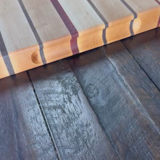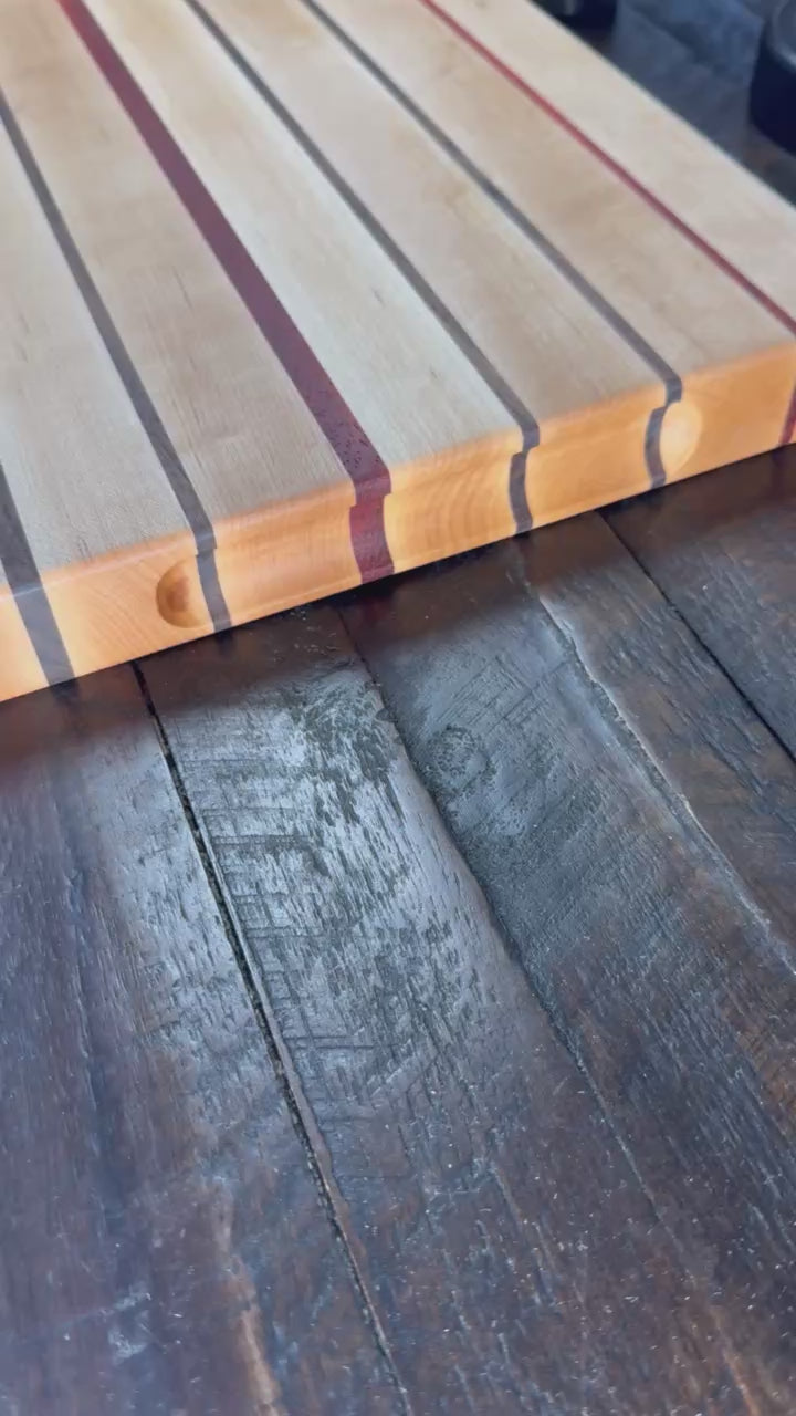 This stunning edge grain cutting board is crafted from Maple with thin stripes of black walnut and purple heart.