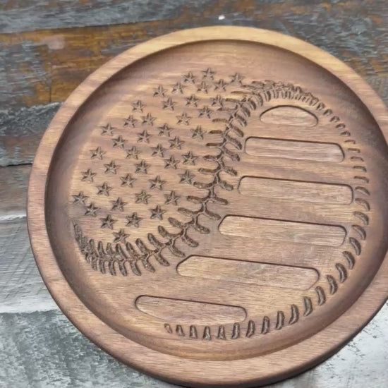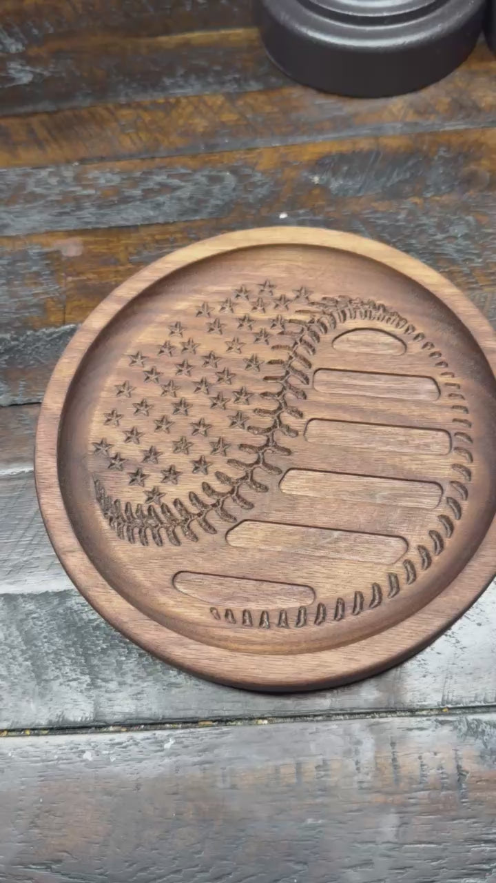Stars and Stripes baseball catchall tray is made from high quality black walnut. The tray 6 3/4" round.
